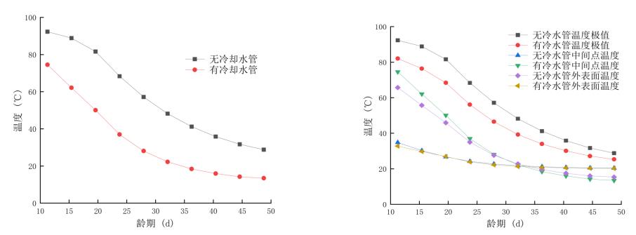 下文取 C60 混凝土,风速 15m/s ,环境温度 15℃,入模温度 25℃为样本,以冷却水流入温度 20℃进行对比分析。