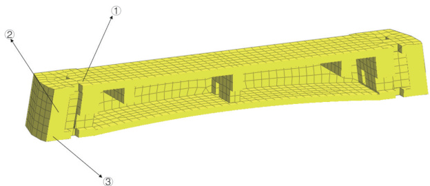 采用有限元软件 Midas FEA,以下横梁剖面图为例建立下横梁精细模型,建立几何单元体,随后进行网格分,共计37424 个单元。