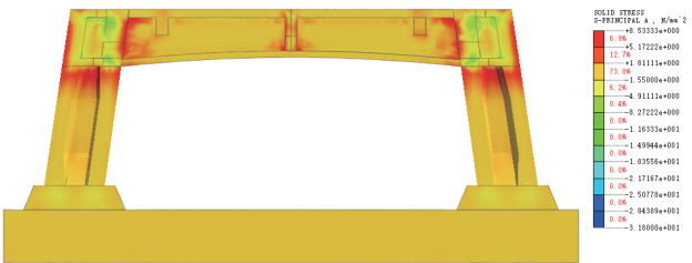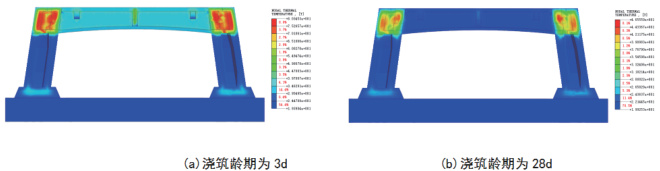4)用强度较低的混凝土进行浇筑能够减 体积混凝土水化热时放出的热量,且最大主拉应力也相对降低,但强度较低难以承受下横梁上部结构传来的荷载。5)降低冷却水的初始温度可以有限的较低混凝土内部的最高温度,最高可减低 3.2℃左右,但冷却水与混凝土温差会增加12℃左右,继而增加大体积混凝土开裂的可能性,故采用20℃的冷却水即可满足规范要求。