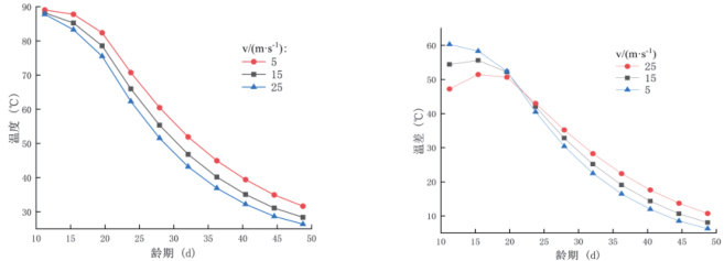 风速是衡量风环境的关键参数,直接影响到大体积混凝土表面换热系数的取值。本文采用平均风速作为实际风速的描述方法,选取三种典型风速(v=5,15,25m/s),依据文献计算出三种风速下表面换热系数分别为(28.12,62.42,95.72kJ·