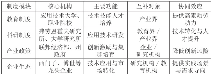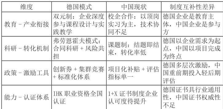 德国工业 4.0 科研联盟的成功,本质上源于其教育制度、科研体系与产业政策之间的高度制度互补性。这种互补性形成了自我强化的创新生态系统:双元制教育输送高素质技术人才,应用型科研机构提供持续技术供给,创新政策则降低转化风险。中国高职院校有组织科研的困境,则源于制度断层导致的互补性缺失——教育链、创新链与产业链彼此割裂。