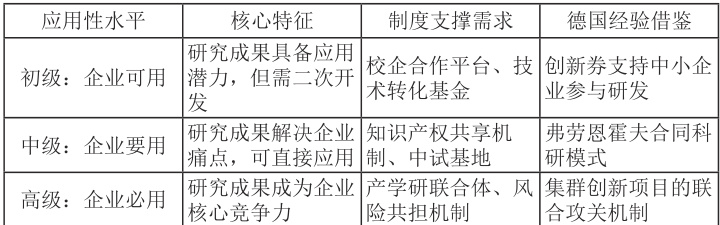 这种错位直接导致科研成果转化率低下。据调研,高职院校应用性研究仅 15% 达到“企业必用”水平(即研究成果成为企业核心技术依赖),35% 处于“企业要用”状态,而高达50% 仅停留在“企业可用”层面。