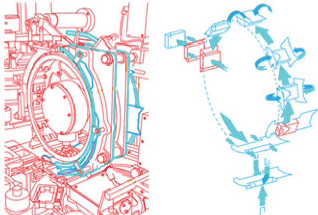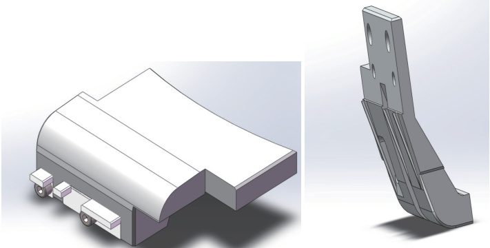 重新设计五进六套口,将套口上下折叠板平面向五号轮侧延伸 15mm,同时,将折叠板 45 度的斜坡平面改为圆弧面,减小套口的导向斜面距离,使烟包在推送折叠成型过程中消除烟包上下变位致使商标纸折叠错位。再将下套口的固定定位板设计为可调整的定位板,且分为前后两段,分别对烟包侧面的侧耳及下侧边进行调整(见图3、4)。
