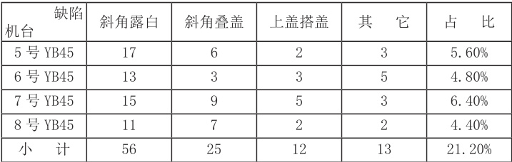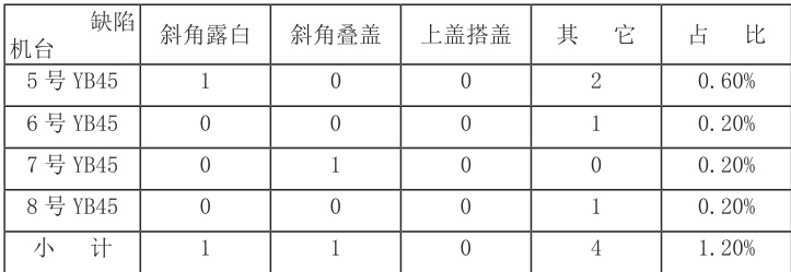 YB45 硬盒包装机在日常生产过程中由于原材料的生产厂家不同,上机的适应性也各不相同,导致小盒烟包的成型度也不尽相同。生产过程中,经常会发现一条烟内有 1-2 包烟外观成型不好的现象(比如小盒斜角露白、斜角叠盖、上盖搭盖等小盒成型的问题),严重影响了产品质量,降低了机台质量的精品率(见烟包成型质量缺陷统计表1),通过对设备调整后,产品质量的稳定性仍然不强,但更换一批材料(或不同厂家)后又不会出现这种质量缺陷,设备的调整频率较高,严重降低设备运行效率。烟包成型质量缺陷统计