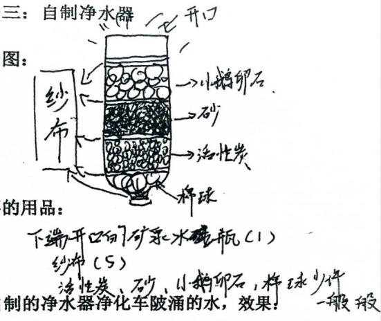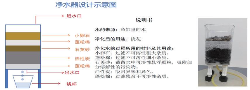 自制净水器是利用过滤、吸附、沉降等方法来净化水质的一种简易装置。在本项目中,学生以小组为单位,通过设计,实施,优化,改进,对自制净水器进行不断的改进,从而达到更佳的净水效果。