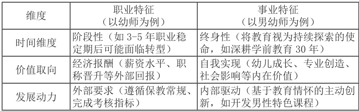 教师职业发展本质上是从“职业”到“事业”的价值升维过程。职业更多体现为基于生存需求的阶段性选择,而事业则是基于内在认同的终身追求。对于幼儿园男教师而言,突破职业困境的关键在于将外部压力转化为内生动力,实现从技能熟练到专业创新、从个体发展到社会贡献的转化。