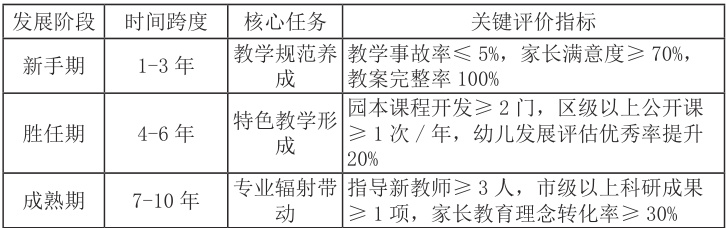 1. 提供“5 年发展路线图模板”,明确各阶段目标(如第1 年:掌握3 项特色教学技能;第3 年:成为园级骨干;第 5 年:形成个人教学风格);