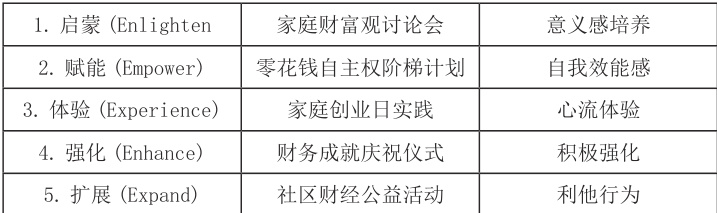 第一阶段启蒙(Enlighten)通过家庭财富观讨论会建立金钱意义认知,培养“钱是工具而非目标”的健康价值观;