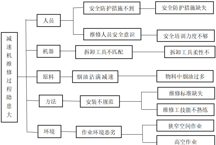 SEW 减速机装配精度要求高、轴承极易损坏,在维修过程时,要求极为严格,需要多人配合采用撬杠等工具才能将 SEW 减速机拆卸,此时,存在着诸多风险隐患,极易对维修人员造成伤害。本文根据实际的维修过程,结合《维修标准化手册》,以及专家分析和维修工现场解读,从人、机、料、法、环五个方面构建了SEW 减速机维修过程风险隐患系统分析图,共总结出8 条末端因素。