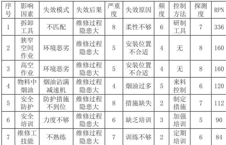为了进一步确定 SEW 减速机维修过程风险隐患的关键因素,本文依据《制丝车间维修准化手册》中确定的频度、严重度和探测度的 FMEA 评价标准,对8 条末端因素进行了 RPN(风险系数)赋值。根据《维修标准化手册》中对 RPN值高于 200 为高风险的判定,本文确定造成维修过程风险隐患的关键因素是工具柔性不足,而且柔性不足的RPN 值要远远高于其他因素。
