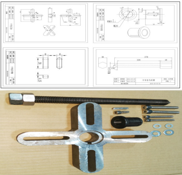 根据三维实体图,绘制了 SEW 减速机拆装工具的工程图,包括拆装工具的主体、拆装工具丝套、拆装工具固定键销以及拆装工具丝杆的图纸,并根据工程图纸进行了加工制作。加工完成后,小组成员对加工件进行了验收,以确保加工件符合设计要求。