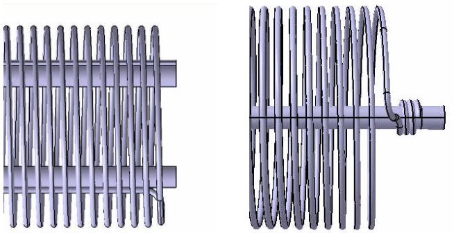 由于加热丝缠绕尖角的存在会导致电阻丝横截面积突变,局部电阻急剧增大,当电流通过时,此处会因焦耳热效应产生过多热量 [5],不仅易造成电阻丝烧断,缩短加热棒使用寿命,还会使加热过程中能量分布不均衡,导致加热棒表面温度分布不均加剧冷却液沸腾的剧烈程度。因此,对镁粉杆引线凹槽位置的结构设计进行优化,可以有效解决加热丝折弯尖角现象的出现。从而使加热丝发热量分布均匀,降低加热器沸腾噪音值。
