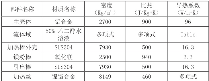 在建立仿真模型时,需要充分考虑加热器的结构特征、零部件及流体域特性参数以及加热器运行工况等因素,为计算模型选取合适的计算方程确保仿真结果的准确性和可靠性。本研究的仿真案例,主要目的是通过设计优化前后加热丝表面温度的变化,验证优化方案对沸腾噪音的改善效果。仿真涉及零部件包括冷却液流体域、加热棒外壳、镁粉棒、引出棒、加热丝等部件,见图4.1。仿真模型建立过程主要包括以下步骤: