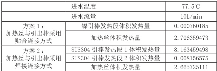 初始设计方案采用加热丝与引出棒贴合连接,见图 3.1。加热器经过长时间运行后,在热胀冷缩作用下,加热丝和引出棒贴合面之间的贴合接触会逐渐变得不稳定。金属表面在高温环境下容易氧化,形成的氧化层具有较高电阻,导致接触电阻增大[4]。根据焦耳定律,电阻值的增加导致产生更多热能,发热源加热丝温度升高会使冷却液沸腾更加剧烈。