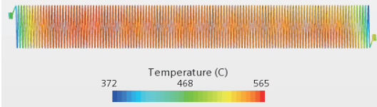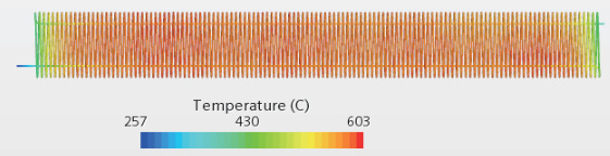 如图 4.2 为方案 1 加热丝的温度分布云图。如图 4.3 为方案 2 加热丝的温度分布云图。首先,从温度分布云图观察,加热丝中间发热区域的颜色过渡均匀,说明加热分布较均匀,避免了局部过热导致的剧烈沸腾。其次,对比两个方案的最高温度值,方案 1 最高温度为603℃,方案 2 最高温度为 565∘C ,说明优化后方案加热丝表面温度降幅达 6.3%,温度降低表明冷却液吸收的热量减少,沸腾反应的剧烈程度减弱,从而间接降低冷却液沸腾噪音。