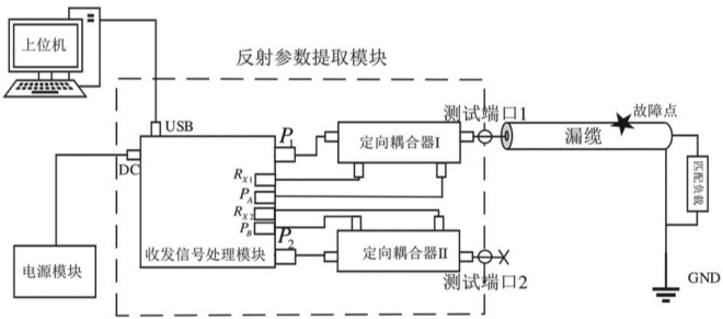 如图 2 所示,实际漏缆检测平台由反射参数提取模块、待测漏缆、 上位机和电源模块四部分组成,其中电源模块为系统供电;反射参数提取 该模块的信号发射子模块产生射频信号,经由定向耦合器的 P1 端 时定向耦合器的耦合端口与隔离端口分别耦合出入射波和反射波信号并 接收子模块, 模块通过 ADC 将模拟信号转换为数字信号后,由 FPGA 模块进行数据处 过 USB 串口与上位机 通 上位机基于采集的入射波和反射波信号计算S 参数,经算法处理最终实现故障定位。