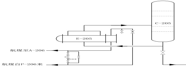 加氢裂化装置于 2010 年 9 月份投产,2017 年新增航煤侧线后,换热流程无法满足增产航煤后外送温度,同时秉着“开源节流,降本增效“的理念,根据实际生产运行情况委托设计院核算,将原 C-205 底柴油换热器改为航煤作为C-205 底热源后能够满足航煤生产,优化装置换热流程,同时保证航煤外送温度。