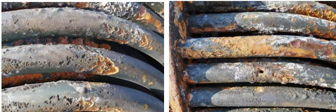 泄漏检测情况来看,此换热器发生泄漏管束腐蚀区域主要位于靠近 U 型弯和管板处,外表面有明显的结垢、点蚀和坑蚀,本次泄漏具体位置在 U 型管弯管部位(共2 处)。