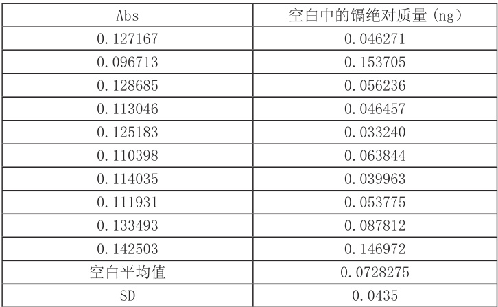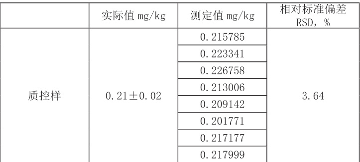 4.2 方法测定下限当进样量为0.1g 时,方法检出限为0.002mg/kg,方法定量限为0.005mg/kg。计算方式:重复10 次测量空白样品,计算出空白样品标准偏差SD。具体数据如下:检出限:LOD= 空白平均值 +3SD定量限:LOQ= 空白平均值 +10SD