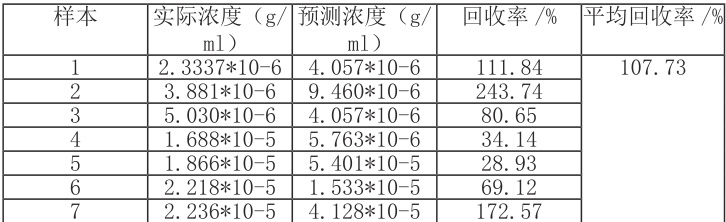 在运用激光诱导荧光技术的过程当中,以酱油作为样品试剂,密度为 1.15g/cm3(海天酿造食品有限公司), 罗丹明 B,化学式为C28H31ClN2O3,分子量是 479.01,密度是 0.791.15g/cm3,子粉丝粉末状(天津市科密欧化学试剂有限公司)。工作人员在搭建好的激光诱导荧光光学实验平台下,抽取 60 次不同浓度的罗丹明 B 样品溶液加入酱油溶液当中,每加入一次样品溶液之后均进行充分搅拌,将其放入到四面透光比色皿当中,使用 50mw 激光器发射 405mm 的紫外光照射样品室当中的比色皿,光谱图的波段范围设置在 540nm 到 630nm,狭缝宽度是0.5mm,曝光时间是1s,循环时间设置1s,实验在常温环境下1d 内完成,在同等实验条件下采集到60 组罗丹明B 浓度范围在1.998*10-9g/m L-6.26374*10-7g/m L 的荧光光谱信息。系统预测的罗丹明 B 回收率结果见表 4。