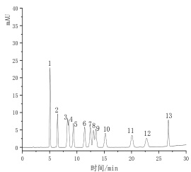 按仪器最佳条件进行测定,得到醛、酮类腙衍生物的色谱图,记录下保留时间和峰面积,见图 1,从图可知 13 种醛酮类化合均得到较好的分离,满足测试要求。