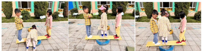 通过屡次实验,孩子们最终觉得在木板之中站一个人是帮助跷跷板保持平衡的最好方法。根据几次尝试的实际情况,他们调整了位置,曹沫祁站到中间,金诺和曹浠月从中心横着向两边移动,平稳到达边缘后,一上一下地玩了起来。结束时,曹沫祁朝后跳了下去,金诺和曹浠月又小心翼翼地往中间挪动,在这过程中木板依然可以维持平衡,测试成功,他们喜上眉梢。这一探索结果表明,孩子们已经能够意识到中间的支撑力量对平衡的重要性,通过中间站人来调节木板两端的重量差异,从而实现平衡。