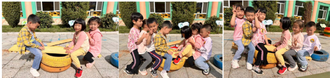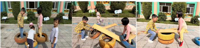 在初步探索过程中,孩子们不断尝试不同的玩法,对木板的特性有了新的认识。曹浠月将木板放在轮胎上的尝试,虽然最初出现了木板掉落的情况,但却让孩子们发现了木板可以借助支撑物实现上下晃动的特性。他们在不断的尝试中,逐渐感受到了木板两端重量变化对木板状态的影响,为后续的深入探索奠定了基础。曹浠月所说的“我们可以像小鸟一样一会呆在地上,一会飞向天空”,不仅体现了她在游戏中的愉悦感受,也反映出孩子们对跷跷板游戏的喜爱和进一步探索的欲望。