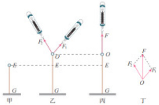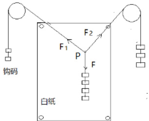 方法二,如图 7 所示,用圆形磁铁将 A4 纸固定在背板上,再将三条细绳打一个共同的绳结 P,中间细绳上挂上几个钩码,左右两条细绳绕过定滑轮后挂上钩码(钩码个数根据需要调整),待稳定后,用铅笔靠近每条细线描点,记录绳结 P 的位置、每条绳子的方向以及二个分力 F 、F 与合力 F 的大小。取下白纸,根据力的图示进行规范作图,能够得到和理论相符的实验结果。