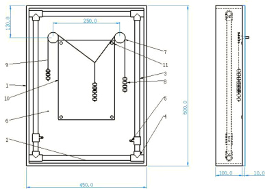 装置设计图 3 中,1 为装置外框支架,需要 600*100*10mm 的防腐木板 2 块,450*100*10mm 的防腐木板 2 块 ;2 与 3为实验固定支架,需要长 445mm、直径 19mm 不锈钢管 2 根,长 550mm、直径 19mm 不锈钢管 2 根;4 为连接部件,需要直径 20mm 塑料三通管 4 个;5 为长 100mm、直径 20mm 的能在固定钢管上移动的塑料水管 2 截,各附带有一个塑料钉;6 为长600*450*5mm 的透明亚克力背板 1 块 ;7 为滑轮 3 个;8 为 50g 钩码 12 个,200g 钩码 1 个;9 是细线若干;10 为 A4 纸 1 张,11 为直径10mm 厚度2mm 圆形磁铁8 个;另外胶水若干,细铁钉若干。