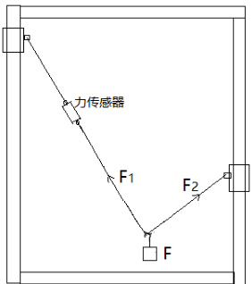 方法一,如图 6 所示,用圆形磁铁将 A4 纸固定在背板上,再将三条细绳打一个共同的绳结 P,其中左右两条细绳绕过定滑轮,绳的两端挂上钩码(钩码个数根据需要调整),用弹簧测力计钩在绳结 P 的另一条细线往上拉。待稳定后,用铅笔靠近每条细线描点,记录绳结 P 点位置、每条绳子的方向以及二个分力 F1、F2 与合力 F 的大小。取下白纸,根据力的图示进行规范作图,能够得到和理论相符的实验结果。