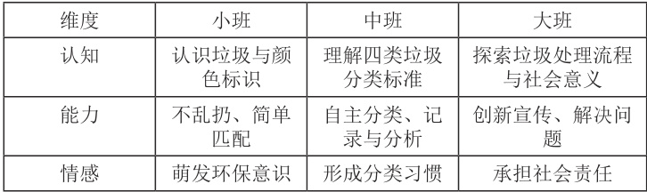 班本活动的有效性始于目标的精准定位。基于皮亚杰认知发展阶段理论及《指南》要求,我们构建“认知 - 能力—情感”三维弹性目标体系(表 1),遵循小班具象感知、中班规则内化、大班实践拓展的阶梯规律,为各年龄段活动设计提供科学基准,确保教育干预与幼儿最近发展区契合。