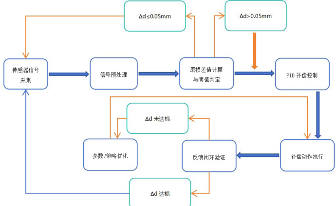 当测得磨损量 Δh⩾0. .05mm 时,控制器通过程序计算得到补偿位移