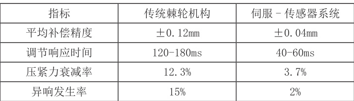 由表 1 可知,伺服—传感器系统在补偿精度、响应速度和可靠性等方面要优于传统的机构,两种系统更换挡位1000 次后的压紧力对比曲线,伺服系统压紧力波动在 ±5% 以内,而传统机构波动达到了 ±12% 。