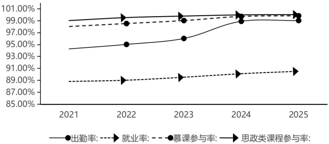 数据显示,通过数智化赋能,学生的政治素养、思想觉悟与综合素质显著提高。学生出勤率由 94.25% 上升为 98.87% ,就业率从 88.79% 提升为 90.09% ,慕课参与率达 99.69% ,其中思政类课程参与率为 99.95% 。同时,学院构建了形成性评价与终结性评价相结合的评价体系,运用大数据技术实现定量评价与定性评价的有效结合,为教学评价提供了科学依据。教师能够根据评价结果及时调整教学策略,实现精准辅导,进一步提升了教育质量。