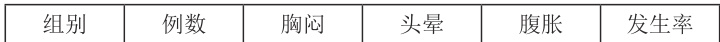 观察两组患者不良反应发生率,不良反应现象具体为胸闷、头晕、腹胀,发生率 Σ=Σ 三项之和/ 总值。