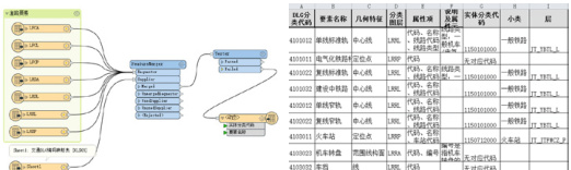 根据分析比对 DLG 与基础地理实体的分类代码与数据分层规则,制作分类代码映射关联表,建立地物 DLG 分类代码与地理实体分类代码的对应关系,使用 FeatureMerger 转换器挂接编码映射表,对匹配了基础地理实体分类代码的要素进行抽取并存储在地理实体的对应图层中。使用 FME 进行要素提取,工作量集中在编码映射表的制作,且可重复利用,极大的提高了工作效率,减少90% 以上的转换时间。