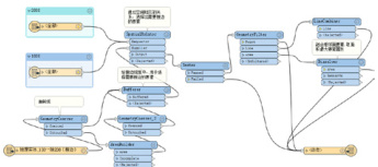 在 实 际 操 作 过 程 中, 灵 活 运 用 了 Counter 转 换 器, 对 道 路 面 进 行 编 号, 使用 LineOnAreaOverlayer 转换器,将道路中心线按面进行分割打断并获取道路面的编号属性,使用 LengthCalculator 转换器对打断后的道路线进行长度计算,使用StatisticsCalculator 转换器,统计出同名称同编号的道路长度总和、同编号道路长度的最大值,当这两个值相等时,即可确认获取到了正确的道路中心线,然后使用 FeatureMerger转换器通过道路面编号值实现属性挂接。