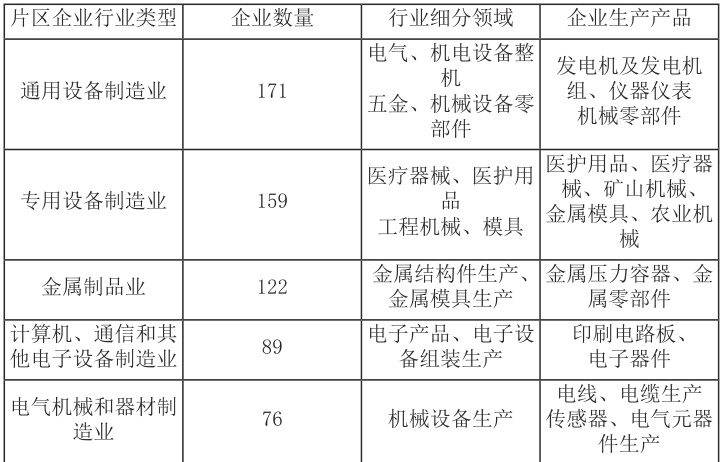 通过调研分析,片区企业密集,并且通用、专用设备类企业占比最高,片区可促进主导产业发展的链族企业基础较强。以通用设备制造、专用设备制造、金属制品制造为前 3 大主导产业,行业细分领域包括电气、机电设备制造,机械零部件制造等。