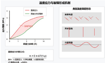 结构中的温度应力分为内约束应力与外约束应力两类。内约束应力源于混凝土内部各点温度不一致引起的膨胀差异,通常在结构表面形成网状或平行裂缝;外约束应力则由于结构整体变形受到基础或已有结构限制,常在混凝土中部形成贯穿性裂缝。对于厚度为 h 的板状结构,中心与表面最大温差ΔT 时,表面最大拉应力可表示为: