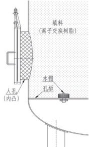 对于混床离子交换设备,使用内凸人孔,在使用过程中存在残留物残留在设备内部。针对此问题应该使用与管壁弧度相同的板作为人孔盖板的内侧壁板(图 1 所示),减小死角从而降低化学品残留等问题可能。