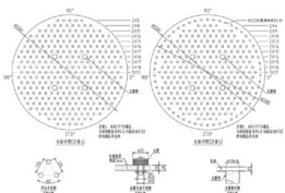 大型过滤设备或者离子交换设备树脂填料层下方的孔板上,安装有很多的水帽,由于孔板与桶身垂直并角缝焊接成型,这些水帽的排列方式、位置可能在局部形成微小的死角。图 3 中对比两种孔板开孔布置水帽的方案,同为 291孔的情况下,实际使用中,方案 b 略优于方案 a,因为孔板与桶身形成直角的位置容易有死角,沿圆周均布水帽更利于角落位置的水流均匀冲刷。