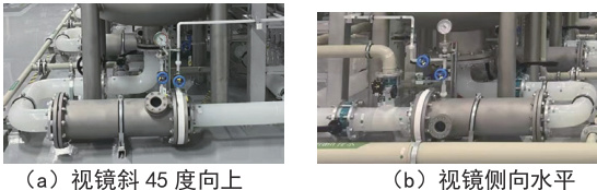 一般设备中每个离子交换设备出口都有树脂捕捉器,以查看或取样来判定该设备是否有树脂泄露。在抛光床出口安装的树脂捕捉器,因为所处位置为抛光系统,此时的水质已很好,树脂捕捉器的视镜安装朝上会有积气难以排出的问题,一定程度上会影响系统溶解氧的指标,但是对抛光床之后有 MDG 膜脱气装置的系统影响不大。对比图 4(a)和图 4(b),将视镜朝水平放置可解决积气问题。