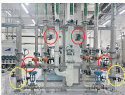 在安装阀组的位置时,需考虑关闭时两侧的死水问题,在设计时应该将支管段长度设计越短越好。控制阀(如图 7 蓝色阀门)两侧的手阀应尽量靠近三通处,因控制阀在维修时需要关断两侧手阀。图 7 中黄色圈中为冲洗口,手阀尽可能靠近冲洗口即可。