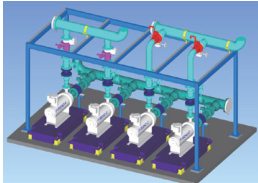 图 8 为超纯水增压泵组三维模型,左侧两组洋红色管段部分对比右侧两组红色管段部分,都是在靠近出口手阀处设置一个 DN25 的冲洗口,左侧是设置在竖直管段上,右侧则设置在水平管段上,系统正常工作时左右两侧没有差异。
