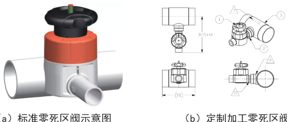 在超纯水供回水(LOOP)系统中,采用零死区阀作为产线用水设备的起始接入阀效果较好(结构示意如图 10 所示)。但受制于厂商特殊阀门模具的开发意愿及难度,对于大尺寸零死区阀,如PVDF-HP 的d160xd63,没有标准产品时,可采用既有产品的组合方式来制造“非标零死区阀”(实际存在很短一段死区<3D)。如图 10 为 d160× d63 定制零死区阀,采用异径三通 d160×d90 + 大小头 d90× d63 + d63 焊接式隔膜阀,每个接口管段均是切至最短后再进行焊接而成。