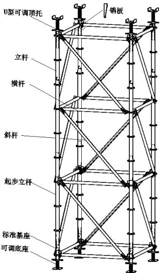 按照 JGJ/T231-2021 的规定,采用 B 型承插盘扣式支架(立杆为 Q345A)形成“立杆- 水平杆- 斜杆”协同受力体系(如图2-1 所示)。设计参数如下: