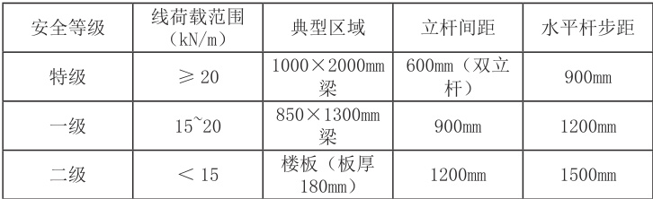 荷载分级:按线荷载划分安全等级(表2-1), 20kN/m 以上区域设置补强立杆(如 1000×2000mm 梁底);