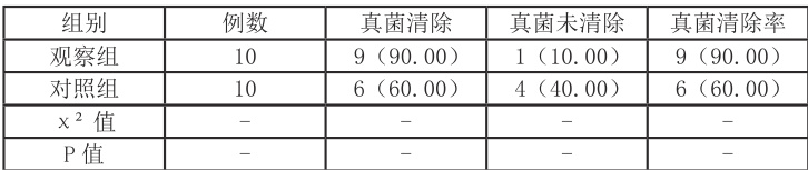 (2)真菌清除率:分别于治疗前和治疗 7 天后采集患者口腔分泌物进行真菌培养。用无菌棉签在患者口腔黏膜病变部位擦拭,采集分泌物,将棉签放入无菌试管中,及时送检。真菌培养结果为阴性者视为真菌清除,真菌清除率