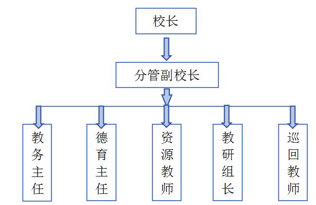 统景小学在 2018 年推行融合教育之初,学校校长作为学校的管理者 积极统筹在学校成立融合教育领导小组,对学校推进融合教育进行整体布局,并履行行政支援和监督功能,为融合教育在统景小学的顺利推进奠定坚实基础。融合教育领导小组成员包括学校校长、分管副校长、教务主任、德育主任、教研组长、资源教师、巡回指导教师。融合教育领导小组结构如图1 所示。