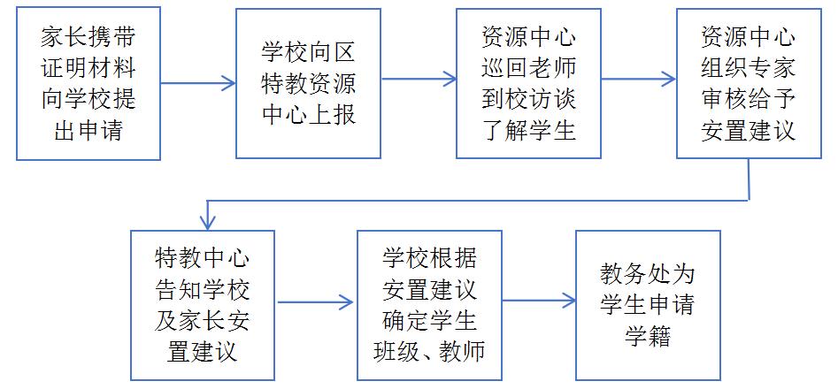 为保障辖区内的特殊学生能顺利入学,统景小学结合渝北区随班就读学生入学安置办法,制定了特殊学生的入学安置制度,首先明确责任人,主要有分管校长、教务主任、资源教师、巡回指导教师来共同完成。其次,由区资源中心协助学校教务主任、资源教师一起评估学校可接收哪些类型的残疾学生。然后,明确特殊学生的安置程序。最后,明确安置办法。统景小学特殊学生安置流程如图2 所示。